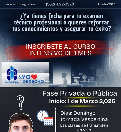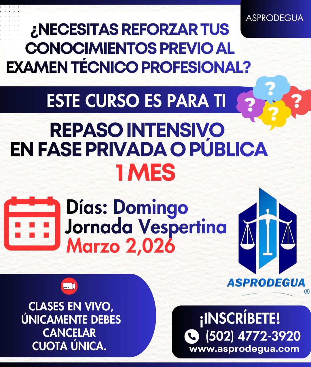 Te instamos en cumplir tus metas, logrando obtener un resultado satisfactorio en el examen técnico profesional fase privada o pública. Participa en nuestro curso apto para todas las universidades de Guatemala, contamos con clases virtuales en vivo, repasos, material y lo mejor, una cuota única.