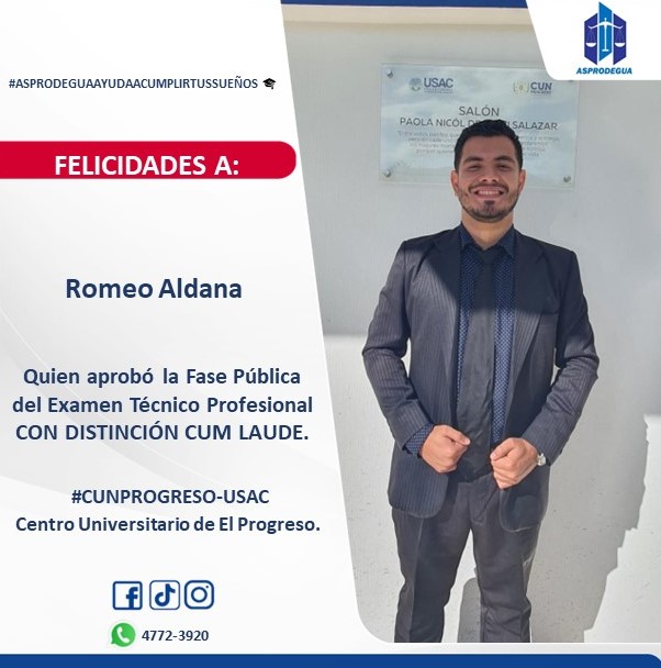 Nos alegramos por el triunfo de Romeo Aldana, por haber sustentado su examen técnico profesional en la FASE PÚBLICA con resultado satisfactorio CON DISTINCIÓN CUM LAUDE, ![]()