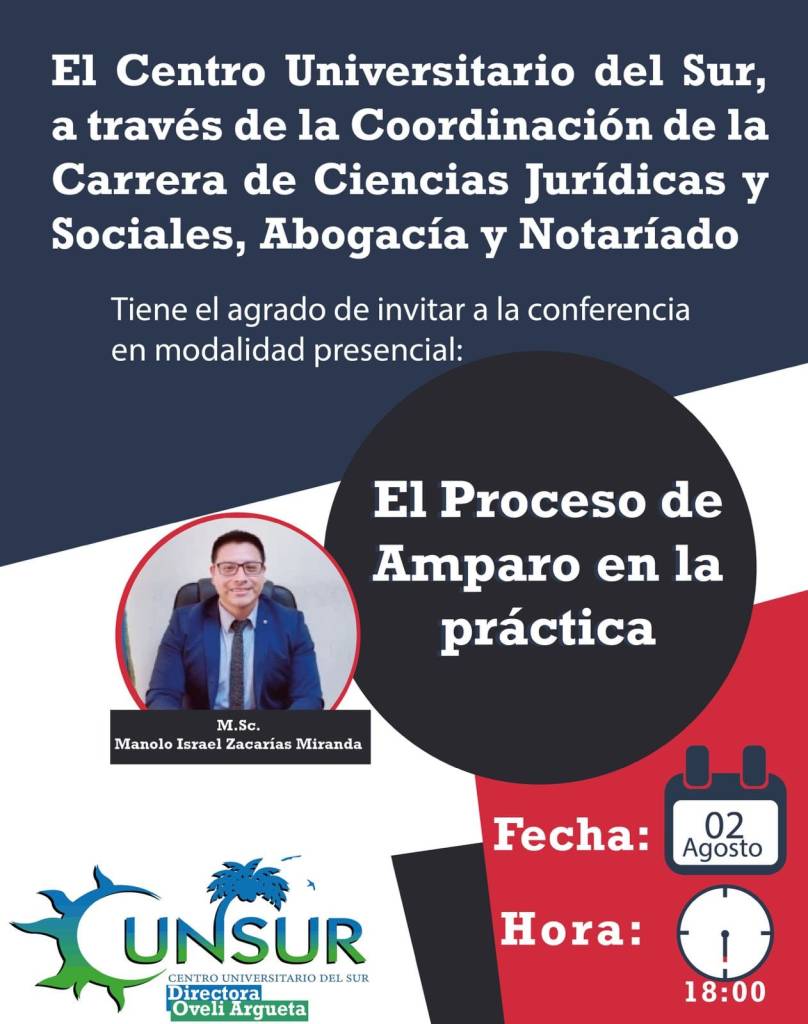 Tema: El Proceso de Amparo en la Práctica Conferencista: Maestro Manolo Zacarías Fecha: 2 de agosto Hora: 18:00 horas Lugar: Centro Universitario del Sur.